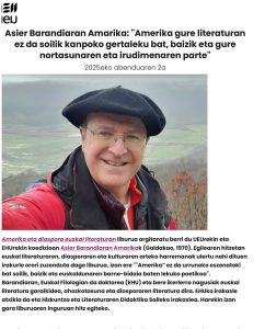 Recensões Literárias Recensões Literárias Oferecemos as nossas críticas literárias aparecidas na imprensa: 2025-12-02“Amerika gure literaturan ez da soilik kanpoko gertaleku bat, baizik eta gure nortasunaren eta irudimenaren parte” ...Leer Más 2025-10-11Artea gizarteratzeko bideakAzalez eta izarezGerrako kronika biziraule baten ahotan ...Leer Más 2025-09-06Sonia Rueda, hitzaren eta irudiaren arteanAurreiritzi zuriak ...Leer Más 2025-08-30Irudi biziak Animadeban ...Leer Más 2025-08-23Arestiren antzerkiari ere berea da zuzenbidea ...Leer Más 2025-08-16Martin Besné Argitaratzaile ...Leer Más 2025-08-02Bideak eta ArratsakOmenaldia Artxandako jatetxean ...Leer Más 2025-07-12AteraldiakBuztina bezala ...Leer Más 2025-06-07Bilbo 1960Benetako historiazBerbekin jolastuz ...Leer Más 2025-06-05Medio siglo sin Aresti, el poeta social con un lugar preferente en el panteón literario vasco ...Leer Más 2025-05-31Gabriel Aresti defiende su legado ...Leer Más 2025-05-10Jesus Guridiren ‘Mari-Eli’ zarzuelaKosmosaren anti-errepresentazio ontologiko bat ...Leer Más 2025-04-12Lauaxeta eta Aresti Santu KulturalakBeharrezko komikiaPedalei itzulika ...Leer Más 2025-03-08Emakumezkoen literatura. Ipuin liburu biBarrenak mugitzen dituen familia testigantza ...Leer Más 2025-03-02Lurdes Iriondo, argia galdu zuen izarra ...Leer Más 2025-02-08Elkarrekin artea, elkarrekin maitasuna ...Leer Más 2025-01-11Poesiaren kritikazEtorkizuneko Euskal HerriaHeteropatriarkatuaren arrailak ...Leer Más 2024-12Santu Kulturalak Euskal Herrian ...Leer Más 2024-12-07Karmele Mitxelenaren zorionaZurikeria zipriztintzekoZubi baten isla ...Leer Más 2024-11-30Nire obrarik potenteena eta profesionalena daAbentura gose ...Leer Más 2024-11-30Nestor Basterretxearen trazu eta diseinuak, Durangon ikusgai ...Leer Más 2024-11-30‘Pleibak’ lanak nerabezaroaren itxiera erakusten digu (pt translation) ...Leer Más 2024-11-09Luis Martín-Santos Mitxelenaren begietan ...Leer Más 2024-09-14Zertarako irakurri idatzi dezakezuneanGurasoek nahitaez irakurri beharreko liburua ...Leer Más 2024-08-24Umoreak berebiziko garrantzia du literaturan, bereziki dituen bertute pedagogikoengatik ...Leer Más 2024-07-27Aterik gabeko poesia: Mark StrandMaletategian ...Leer Más 2024-07-20Arrakasta duenarekiko mesfidantza dago ...Leer Más 2024-07-06Jazzaren irudikapena jaialdien karteletan ...Leer Más 2024-07-06Basterretxearen marrazteko grina ...Leer Más 2024-05-11Juan Carlos Eguillorren izaeraEzkutuko heroia ...Leer Más 2024-04-06Itzulpen miresgarri bi (edo hiru)Zalantzatik ikasi ...Leer Más 2024-03-09Annie Ernaux bi aldizLokarriak munduan ...Leer Más 2024-02-10Hegoak eta txoriak ...Leer Más 2024-01-13Gaixoa eta literatura. Hiru adibideAskatasun amorrua ...Leer Más 2023-12-09Harkaitz Cano labirintoan gaur egungo euskal literatur paisaiaMakina bat gizaki ...Leer Más 2023-11-18Hilerrien literaturazGenero literarioen mugarriak ...Leer Más 2023-10-21Verineseko Solasaldiak 2023anOdolbildua ...Leer Más 2023-10-15¡Puto fútbol! Literatura vasca a balonazos ...Leer Más 2023-10-14Un terreno fértil para los libros ...Leer Más 2023-10-14Todo un campo para leer ...Leer Más 2023-10-14La primera frase en euskera conocida de Gabriel Aresti ...Leer Más 2023-10-11Un libro aborda la presencia del fútbol en diferentes géneros literarios en la ficción vasca ...Leer Más 2023-10-09Letras y esencias vascas ...Leer Más 2023-09-30Euskarazko irakurgaiak aurtengo Getxoko Komiki AzokanEkofeminismoaz ...Leer Más 2023-09-21Un libro recopila las reseñas de Javier Rojo, 25 años de literatura en euskera ...Leer Más 2023-09-16Arteari buruzko liburu biNaturaren kultura ...Leer Más 2023-08-12Santu kulturalak: literaturaren bide bihuarriakZirku gizona ...Leer Más 2023-07-29Liburu denden diseinua eta gure irakurle bizitza ...Leer Más 2023-06-17Bertsolari eta idazleGiro arrotzean ...Leer Más 2023-05-27Barkamenik ez ...Leer Más 2023-05-20Maitasunez egindako liburuakMusikaren boterea ...Leer Más 2023-05-13 Xolaren berpizkundea ...Leer Más 2023-05-06Mundu osoko kondairak ...Leer Más 2023-05-05Eskultura eta literatura ...Leer Más 2023-04-29Hilartitzetan ...Leer Más 2023-04-22Karmele Jaio, erizain irakurzalea eta hirurokMikropolifonia ...Leer Más 2023-04-15Korta zaharreko zuloak ...Leer Más 2023-04-07Amildegitik gertu ...Leer Más 2023-04-01Dragoiak eta sugetzarrak ...Leer Más 2023-03-181957ko uda ...Leer Más 2023-03-11Itzulpenak digitu hizpideErnaberritzen ...Leer Más 2023-03-04Heriotza, etsairik ez ...Leer Más 2023-02-25Ilargiaren eraginpean ...Leer Más 2023-02-18Aldiberekotasunak 2022ko euskal poesianTren geralekuetan ...Leer Más 2023-02-11Maitasunaren alde biak ...Leer Más 2023-02-04Fantasia eta mitologia ...Leer Más 2023-01-211963an jaiotako euskal idazleak 60 urte betetzearOrainez oinazez ...Leer Más 2023-01-14Holokaustoko saguak ...Leer Más 2023-01-07Alegatu ekologista ...Leer Más 2022-12-31Geldi eta isil ...Leer Más 2022-12-24Liburu bat egunero (eta ahal dela, bi)Irakurriz bizi ...Leer Más 2022-12-17Euskal literatura ...Leer Más 2022-12-10Gozamen futurista ...Leer Más 2022-11-27Galeren poetika ...Leer Más 2022-11-26Eztarrian, Gernika ...Leer Más 2022-11-12Txoria eta ornitologoaBazen behin, ipuina ...Leer Más 2022-10-29Klase-kontzientziaz ...Leer Más 2022-10-22Emakume poeta ahaztuak ...Leer Más 2022-10-15Campus nobelak gure literaturanAlegiak birsortuz ...Leer Más 2022-10-08Gizatasuna hizpide ...Leer Más 2022-10-01Gure ondarea indarberrituz ...Leer Más 2022-09-24Erloju hila ...Leer Más 2022-09-17Litera/turismoaIdi adarmotza ...Leer Más 2022-09-10Kolonialismoaren usaina ...Leer Más 2022-09-03Filosofia haurrekin ...Leer Más 2022-08-20Denbora eta aukera: Irati Elorrieta ...Leer Más 2022-06-25Joan-etorria Iparraldeko literaturanGaltzerdiak bularretakotan ...Leer Más 2022-06-18Mama mami mamu ...Leer Más 2022-06-11Memoriaren arkitektura ...Leer Más 2022-06-04Hitz baten lilura ...Leer Más 2022-05-28Sastraka: 