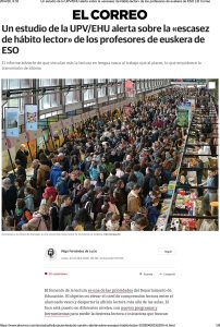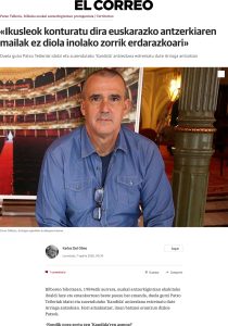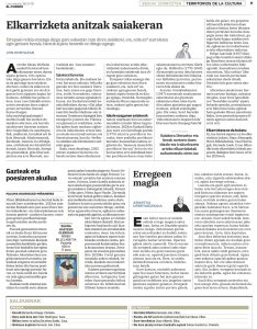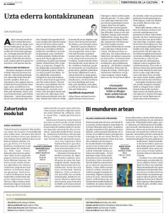 Reseñas literarias Reseñas Literarias Te ofrecemos nuestras críticas literarias que se publican en prensa: 2026-04-20Un estudio de la UPV/EHU alerta sobre la «escasez de hábito lector» de los profesores de euskera de ESO ...Leer Más 2026-04-11Ikusleok konturatu dira euskarazko antzerkiaren mailak ez diola inolako zorrik erdarazkoari ...Leer Más 2026-04-03Artea ere, ingurumenari begira ...Leer Más 2026-03-14Kontakizuna poesian. Oroimena gureanMemoria ernalduzLower East Side-ren historia bat ...Leer Más 2026-02-09La escritura sirve para hacer nación ...Leer Más 2026-02-07Lauaxetaren semeaPiercing bat udaberrian ...Leer Más 2026-01-10Elkarrizketa anitzak saiakeranGazteak eta poesiaren akuilua ...Leer Más 2025-12-26La muerte de Unamuno presenta «indicios elevados» de criminalidad ...Leer Más 2025-12-13Relatos en Kentucky: la duda y la derrota ...Leer Más 2025-12-08Ibilbide grafikoa karteletan zehar ...Leer Más 2025-12-06Uzta ederra kontakizuneanZahartzeko modu batBi munduren artean ...Leer Más 2025-12-06El detalle y el símbolo ...Leer Más 2025-12-02«Amerika gure literaturan ez da soilik kanpoko gertaleku bat, baizik eta gure nortasunaren eta irudimenaren parte» ...Leer Más 2025-11-29Arantxa Urretabizkaia: idaztean ez dut zaharrengan pentsatu, jakin-min a duenarengan baizik ...Leer Más 2025-11-2250 urte pasa dira mendeak 25 betetzen dituenean ...Leer Más 2025-10-11Artea gizarteratzeko bideakAzalez eta izarezGerrako kronika biziraule baten ahotan ...Leer Más 2025-09-06Sonia Rueda, hitzaren eta irudiaren arteanAurreiritzi zuriak ...Leer Más 2025-08-30Irudi biziak Animadeban ...Leer Más 2025-08-23Arestiren antzerkiari ere berea da zuzenbidea ...Leer Más 2025-08-16Martin Besné Argitaratzaile ...Leer Más 2025-08-02Bideak eta ArratsakOmenaldia Artxandako jatetxean ...Leer Más 2025-07-12AteraldiakBuztina bezala ...Leer Más 2025-06-07Bilbo 1960Benetako historiazBerbekin jolastuz ...Leer Más 2025-06-05Medio siglo sin Aresti, el poeta social con un lugar preferente en el panteón literario vasco ...Leer Más 2025-05-31Gabriel Aresti defiende su legado ...Leer Más 2025-05-10Jesus Guridiren ‘Mari-Eli’ zarzuelaKosmosaren anti-errepresentazio ontologiko bat ...Leer Más 2025-04-12Lauaxeta eta Aresti Santu KulturalakBeharrezko komikiaPedalei itzulika ...Leer Más 2025-03-08Emakumezkoen literatura. Ipuin liburu biBarrenak mugitzen dituen familia testigantza ...Leer Más 2025-03-02Lurdes Iriondo, argia galdu zuen izarra ...Leer Más 2025-02-08Elkarrekin artea, elkarrekin maitasuna ...Leer Más 2025-01-11Poesiaren kritikazEtorkizuneko Euskal HerriaHeteropatriarkatuaren arrailak ...Leer Más 2024-12Santu Kulturalak Euskal Herrian ...Leer Más 2024-12-07Karmele Mitxelenaren zorionaZurikeria zipriztintzekoZubi baten isla ...Leer Más 2024-11-30Nire obrarik potenteena eta profesionalena daAbentura gose ...Leer Más 2024-11-30Nestor Basterretxearen trazu eta diseinuak, Durangon ikusgai ...Leer Más 2024-11-30'Pleibak' lanak nerabezaroaren itxiera erakusten digu ...Leer Más 2024-11-09Luis Martín-Santos Mitxelenaren begietan ...Leer Más 2024-09-14Zertarako irakurri idatzi dezakezuneanGurasoek nahitaez irakurri beharreko liburua ...Leer Más 2024-08-24Umoreak berebiziko garrantzia du literaturan, bereziki dituen bertute pedagogikoengatik ...Leer Más 2024-07-27Aterik gabeko poesia: Mark StrandMaletategian ...Leer Más 2024-07-20Arrakasta duenarekiko mesfidantza dago ...Leer Más 2024-07-06Jazzaren irudikapena jaialdien karteletan ...Leer Más 2024-07-06Basterretxearen marrazteko grina ...Leer Más 2024-05-11Juan Carlos Eguillorren izaeraEzkutuko heroia ...Leer Más 2024-04-06Itzulpen miresgarri bi (edo hiru)Zalantzatik ikasi ...Leer Más 2024-03-09Annie Ernaux bi aldizLokarriak munduan ...Leer Más 2024-02-10Hegoak eta txoriak ...Leer Más 2024-01-13Gaixoa eta literatura. Hiru adibideAskatasun amorrua ...Leer Más 2023-12-09Harkaitz Cano labirintoan gaur egungo euskal literatur paisaiaMakina bat gizaki ...Leer Más 2023-11-18Hilerrien literaturazGenero literarioen mugarriak ...Leer Más 2023-10-21Verineseko Solasaldiak 2023anOdolbildua ...Leer Más 2023-10-15¡Puto fútbol! Literatura vasca a balonazos ...Leer Más 2023-10-14Un terreno fértil para los libros ...Leer Más 2023-10-14Todo un campo para leer ...Leer Más 2023-10-14La primera frase en euskera conocida de Gabriel Aresti ...Leer Más 2023-10-11Un libro aborda la presencia del fútbol en diferentes géneros literarios en la ficción vasca ...Leer Más 2023-10-09Letras y esencias vascas ...Leer Más 2023-09-30Euskarazko irakurgaiak aurtengo Getxoko Komiki AzokanEkofeminismoaz ...Leer Más 2023-09-21Un libro recopila las reseñas de Javier Rojo, 25 años de literatura en euskera ...Leer Más 2023-09-16Arteari buruzko liburu biNaturaren kultura ...Leer Más 2023-08-12Santu kulturalak: literaturaren bide bihuarriakZirku gizona ...Leer Más 2023-07-29Liburu denden diseinua eta gure irakurle bizitza ...Leer Más 2023-06-17Bertsolari eta idazleGiro arrotzean ...Leer Más 2023-05-27Barkamenik ez ...Leer Más 2023-05-20Maitasunez egindako liburuakMusikaren boterea ...Leer Más 2023-05-13 Xolaren berpizkundea ...Leer Más 2023-05-06Mundu osoko kondairak ...Leer Más 2023-05-05Eskultura eta literatura ...Leer Más 2023-04-29Hilartitzetan ...Leer Más 2023-04-22Karmele Jaio, erizain irakurzalea eta hirurokMikropolifonia ...Leer Más 2023-04-15Korta zaharreko zuloak ...Leer Más 2023-04-07Amildegitik gertu ...Leer Más 2023-04-01Dragoiak eta sugetzarrak ...Leer Más 2023-03-181957ko uda ...Leer Más 2023-03-11Itzulpenak digitu hizpideErnaberritzen ...Leer Más 2023-03-04Heriotza, etsairik ez ...Leer Más 2023-02-25Ilargiaren eraginpean ...Leer Más 2023-02-18Aldiberekotasunak 2022ko euskal poesianTren geralekuetan ...Leer Más 2023-02-11Maitasunaren alde biak ...Leer Más 2023-02-04Fantasia eta mitologia ...Leer Más 2023-01-211963an jaiotako euskal idazleak 60 urte betetzearOrainez oinazez ...Leer Más 2023-01-14Holokaustoko s